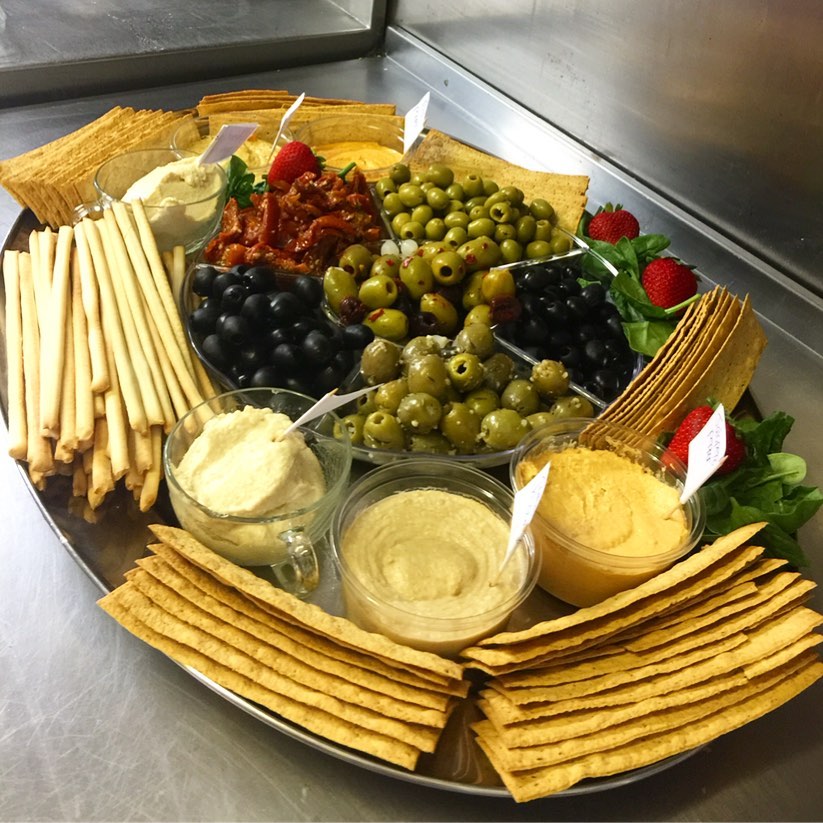 Fancy something to remind you of a holiday in the Greek Islands? How about our Mediterranean Platter of olives, breadsticks and hummus dips. We could also add a selection of cheeses or cured meats.